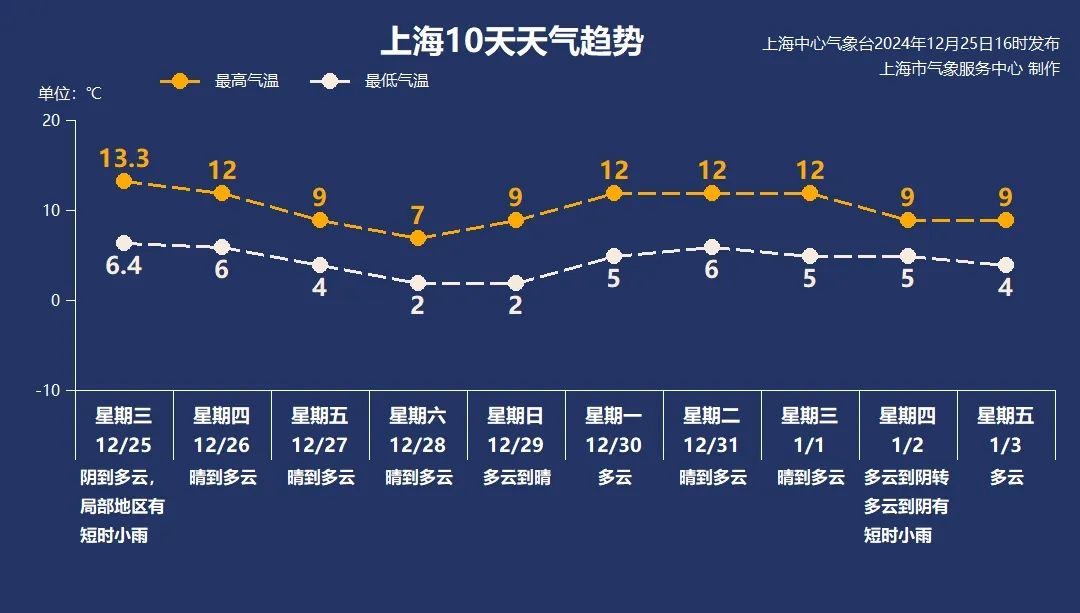 明天起上海逐漸轉受冷空氣影響。 本週末上海將主打晴或多雲的天氣,但風力增大,氣温下降,部分郊區最低氣温降幅可達寒潮標準。過程極端最低氣温出現在雙休日的早晨,市區2℃左右,部分郊區零下3~零下4℃,有冰凍,或創下半年新低。 冷空氣影響過後,下週一白天起氣温開始回升,最高氣温在12℃上下。我們有望在一個相對温暖的天氣中跨年。 氣温起起伏伏,大家多關注天氣變化,適時調整着裝,謹防感冒。