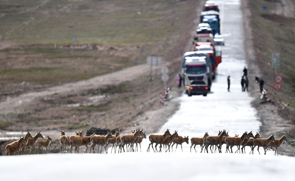 一羣藏羚羊通過青藏公路前往青海三江源地區(2023年7月28日攝)。新華社記者 張宏祥 攝