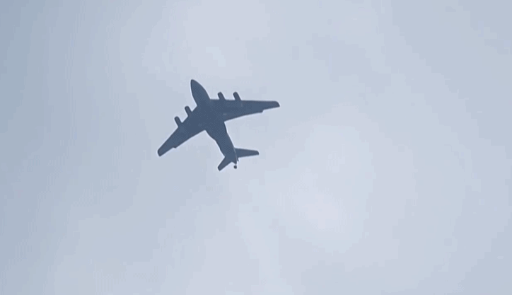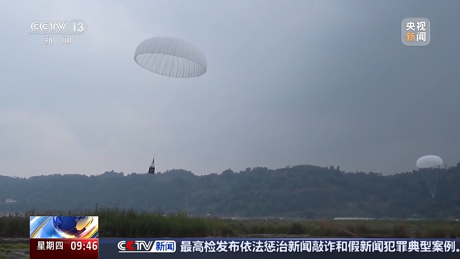 隨着機長下達投下口令,朵朵傘花在空中綻放,帶着空投物件飄向靶標方向。