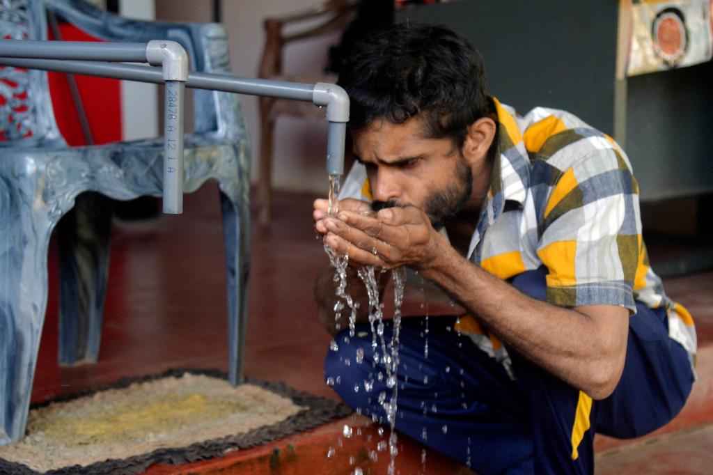 10月2日,在斯里蘭卡中北部地區尼迪亞村,村民正在中國援建的飲用水裝置前飲水。新華社發(加揚·薩米拉攝)