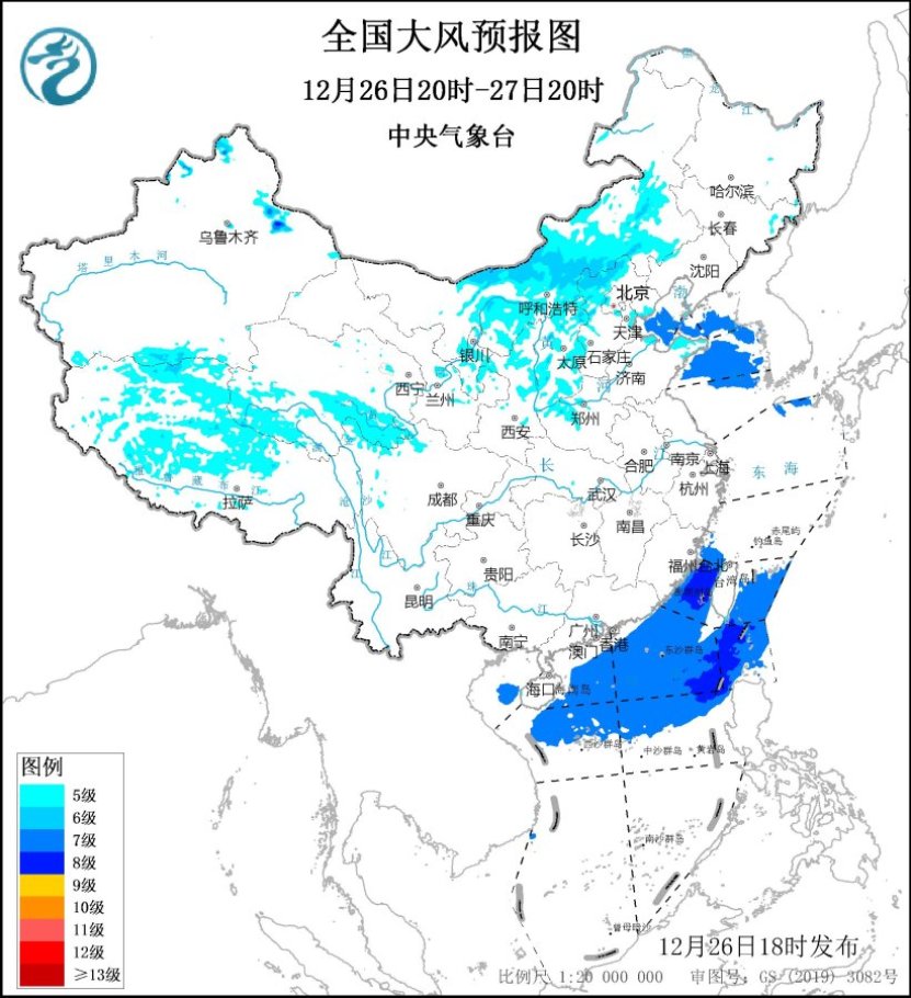 26日夜間至27日,受冷空氣影響,西北地區東部、華北西部、黃淮西部、江漢、江淮、江南東部和北部、華南東部等地部分地區有4~6℃降温,局地降温8℃以上。預計,12月26日20時至27日20時,內蒙古中部、甘肅東部、寧夏、山西、河北北部、北京西部、天津、新疆沿天山地區、青海南部、西藏中北部、山東半島等地部分地區有5~6級風、陣風7~8級,其中,河北北部、西藏中北部等地局地陣風9級;渤海、渤海海峽、黃海大部海域、台灣海峽、台灣以東洋麪、巴士海峽、南海大部海域將有7~8級、陣風9~10級的大風(見圖1)。中央氣象台12月26日18時繼續發佈大風藍色預警。