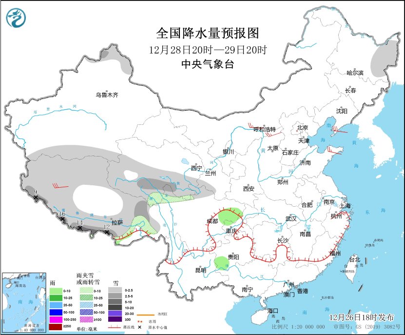 *12月28日20時至29日20時,*新疆北疆北部和南疆盆地南、西藏大部、青海中南部、黑龍江東部等地部分地區有小雪或雨夾雪,其中,新疆北疆北部、青海南部等地部分地區有中雪,西藏西南部等地局地暴雪(10~16毫米)。四川盆地東部、重慶西部、貴州西南部等地部分地區有小雨。內蒙古中部、遼東半島、西藏西部、山西北部、山東半島、浙江北部等地部分地區有4~6級風;渤海、黃海北部、渤海海峽、東海、台灣海峽、台灣以東洋麪、巴士海峽、南海等海域將有7~8級、陣風9~10級的大風(見圖4)。