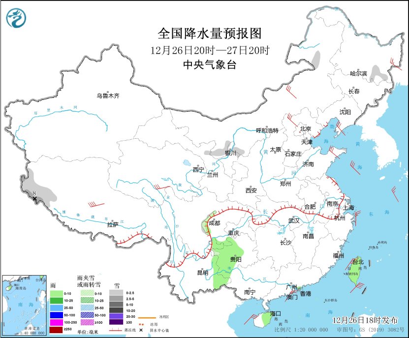 *12月26日20時至27日20時,*西藏西部、內蒙古西南部和東北部、黑龍江東南部、寧夏北部、川西高原東部、貴州西部、山東半島東北部等地部分地區有小雪或雨夾雪,其中,西藏西部部分地區有中到大雪(5~8毫米)。四川盆地南部、貴州中西部、雲南東部、廣西西北部、海南島中東部、台灣島等地部分地區有小雨。內蒙古中部、青海南部、河北北部、北京西部、天津、黑龍江東部、遼東半島、山東半島等地部分地區有4~6級風,陣風7~8級(見圖2)。