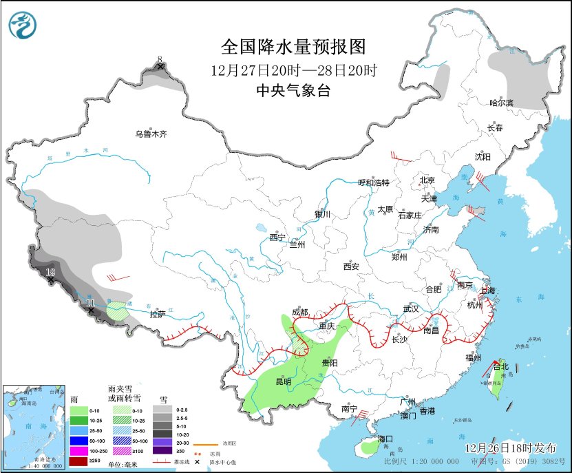 *12月27日20時至28日20時,*新疆北疆北部和南疆盆地西南部、西藏西部、內蒙古東北部、黑龍江中西部、山東半島等地部分地區有小雪或雨夾雪,其中,新疆北疆北部部分地區有中到大雪,西藏南部和西部等地局地暴雪(10~19毫米)。四川盆地西南部、貴州中西部、雲南中東部、海南島中部、台灣島等地部分地區有小雨。內蒙古中北部、西藏中部、山東半島、遼東半島、江蘇南部、浙江北部等地部分地區有4~6級風;黃海中部和南部海域、東海大部海域、台灣海峽、台灣以東洋麪、巴士海峽、南海大部海域、北部灣將有7~8級、陣風9~10級的大風(見圖3)。