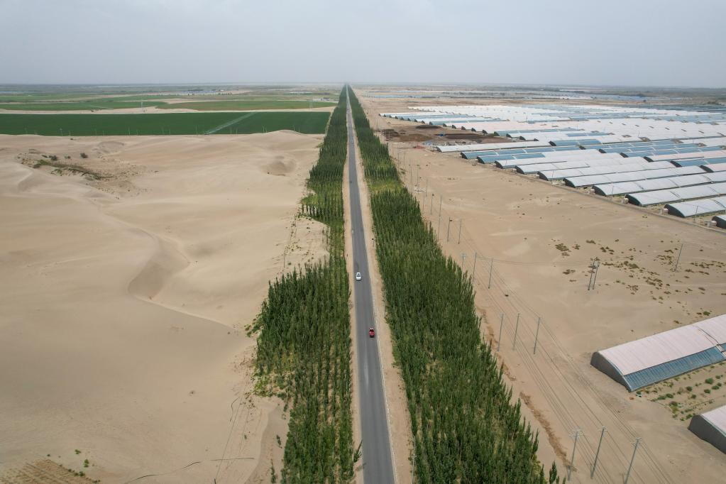 這是2024年6月20日拍攝的新疆和田地區和田縣的防護林帶,道路兩邊是沙漠飼草基地和設施農業基地(無人機照片)。新華社記者 丁磊 攝