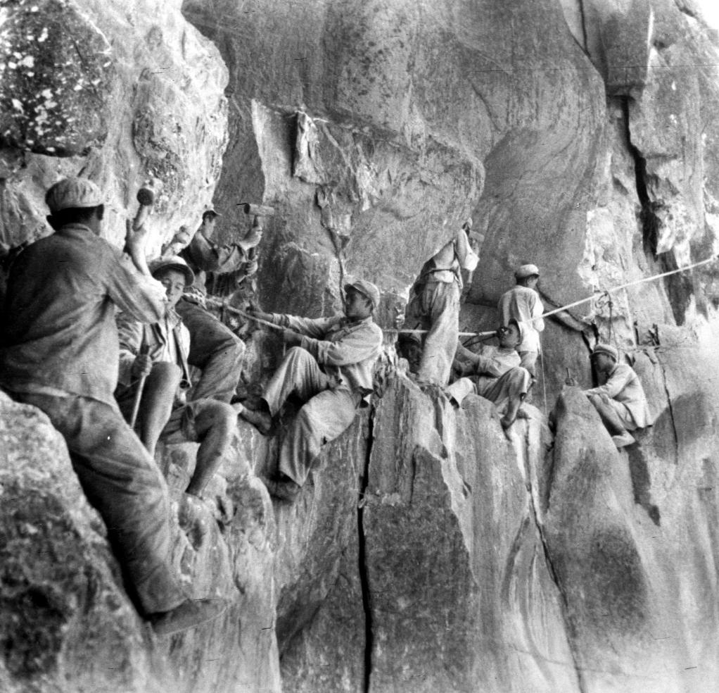 築路戰士在怒江兩岸的懸崖陡壁上闢山築路(資料照片)。新華社發