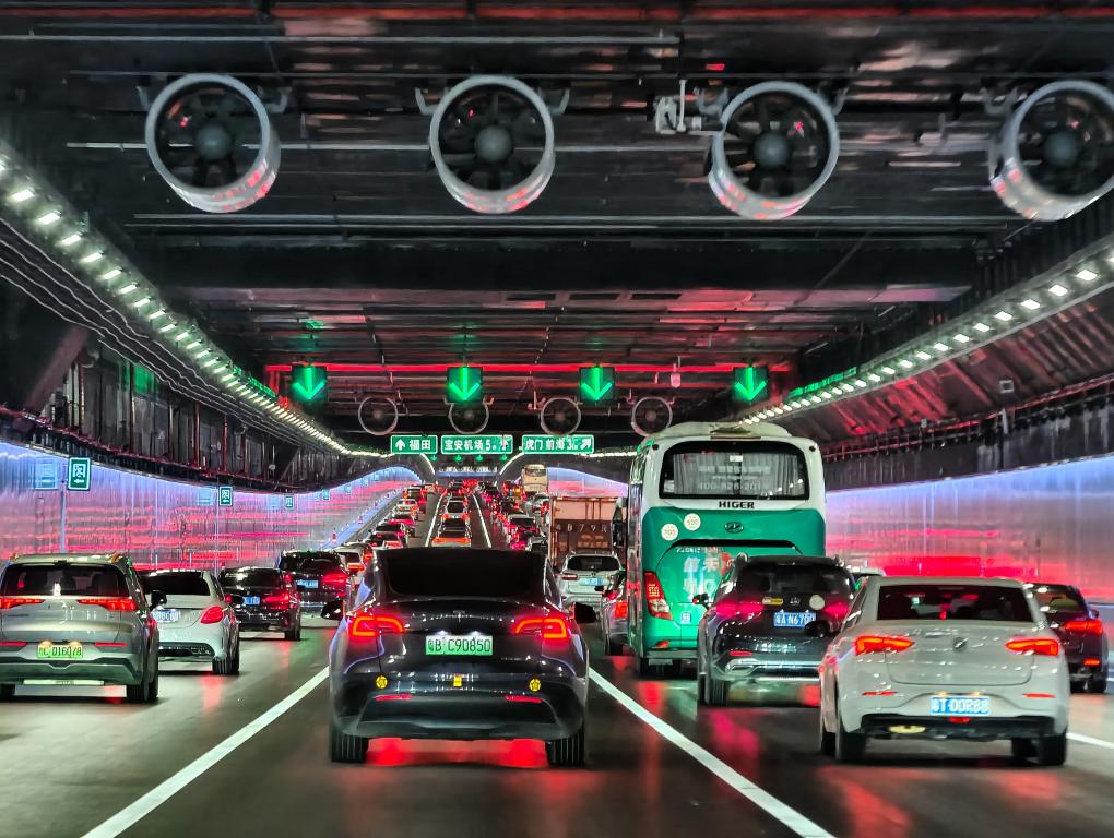這是2024年6月30日開通首日的深中通道海底沉管隧道內的車流。新華社記者 劉大偉 攝