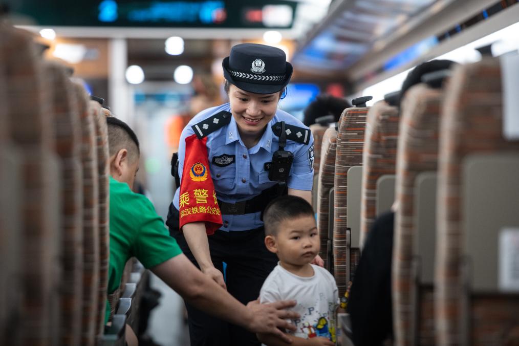2024年6月15日,在武漢至深圳北的G875次列車上,乘警在引導小朋友回到座位。新華社記者 伍志尊 攝