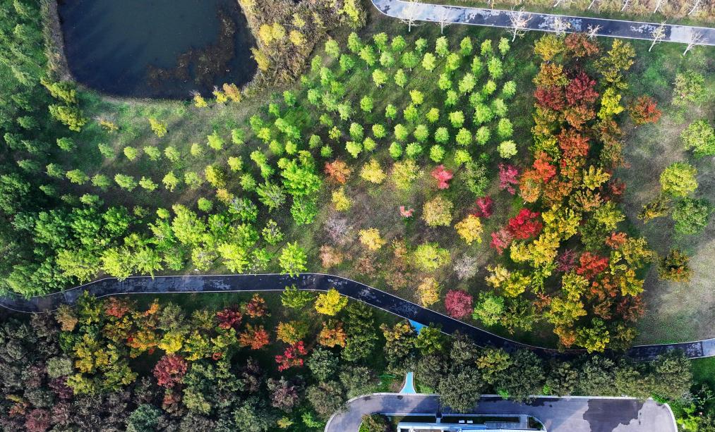 2024年10月28日,位於長江揚州段一處“口袋公園”秋景(無人機照片)。金秋時節,神州大地層林盡染,色彩斑斕,秋色宜人。新華社發(孟德龍 攝)