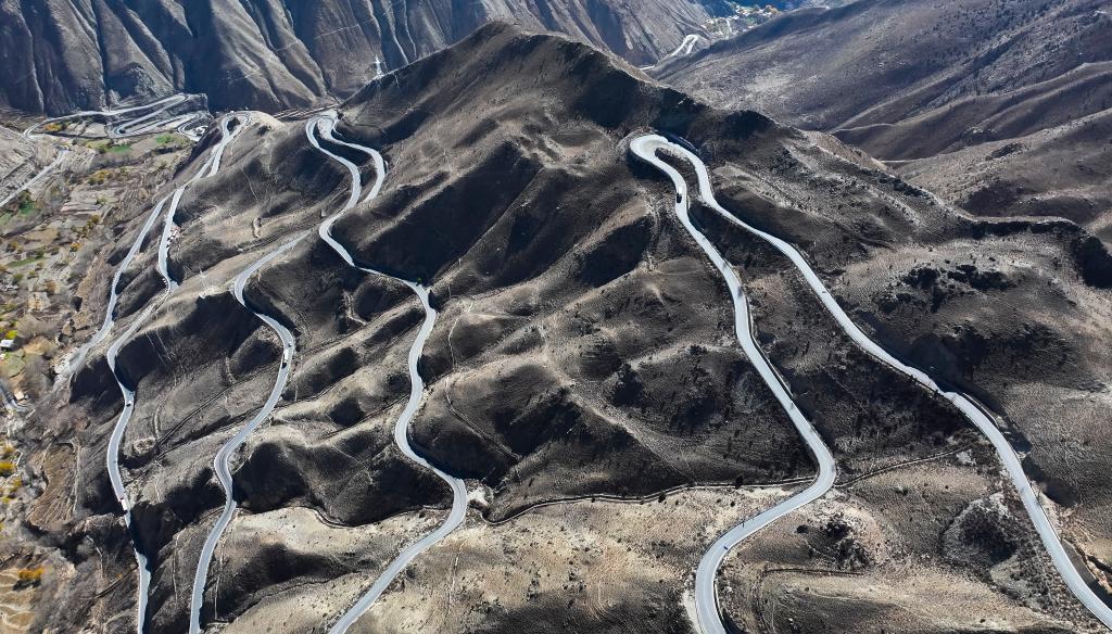 這是2024年11月16日拍攝的位於西藏自治區昌都市八宿縣境內的“怒江72拐”(無人機照片)。新華社記者 格桑朗傑 攝