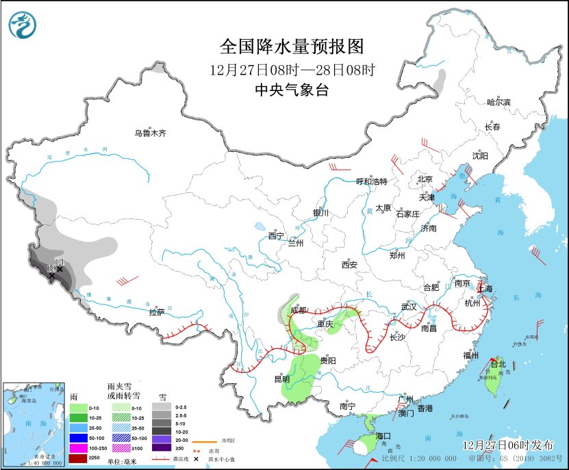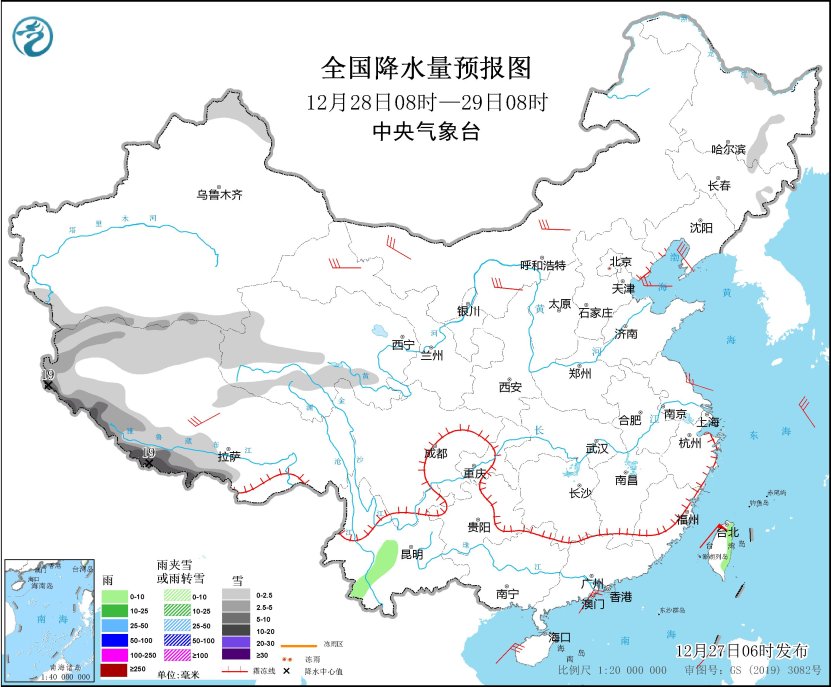 *12月27日08時至28日08時,*西藏西部、新疆西南部、川西高原東部、貴州西部、內蒙古東北部等地部分地區有小雪或雨夾雪,其中,西藏西部部分地區有中到大雪,局地暴雪(10~19毫米)。湖北西南部、四川盆地南部、重慶中部、貴州東北部和西部、雲南東部、廣西西北部、海南島中東部、台灣島等地部分地區有小雨。內蒙古中部、山西、河北北部、北京西部、天津、遼東半島、山東半島、西藏中北部等地部分地區有4~6級風、陣風7~8級(見圖2)。