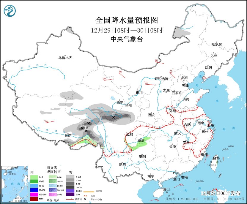 27日至29日,西藏南部和東部至青海東南部自西向東有中到大雪,其中,27-28日西藏南部局地暴雪或大暴雪(累積降雪量20~25毫米,局地30毫米以上),新增積雪深度5~10cm、局地25cm以上,29日西藏東部、青海東南部有小到中雪,局地大雪。
