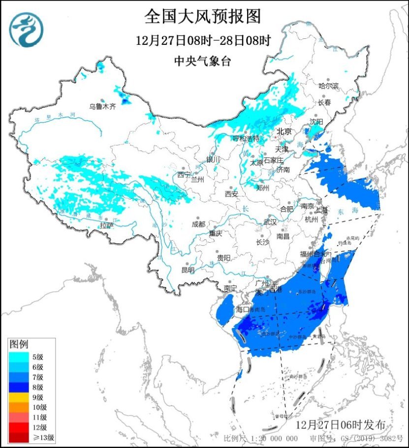 今天,受冷空氣影響,西北地區東部、西南地區東北部、江漢、江淮西部、江南、華南北部等地部分地區有4~6℃降温。未來24小時,內蒙古中部、寧夏、山西、河北北部、北京西部、天津、新疆沿天山地區、青海南部、西藏中北部、遼東半島、山東半島等地部分地區風力大,陣風7~8級,河北北部、西藏中北部局地陣風風力可達9級;渤海、渤海海峽、黃海大部海域、東海北部海域、台灣海峽、台灣以東洋麪、巴士海峽、南海大部海域、北部灣將有7~8級大風,陣風9~10級,中央氣象台今晨繼續發佈大風藍色預警。