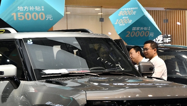 消費者在車展現場瞭解以舊換新的車輛補貼政策