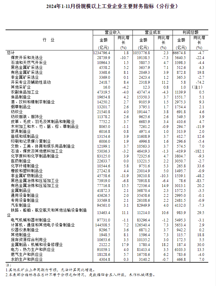 國家統計局今天發佈的最新數據顯示,1—11月份,全國規模以上工業企業實現利潤總額66674.8億元,同比下降4.7%。