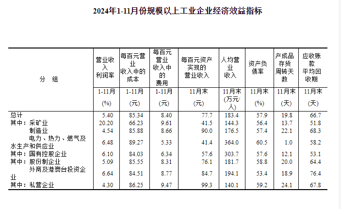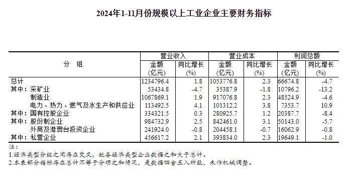 1—11月份,採礦業實現利潤總額10796.2億元,同比下降13.2%;製造業實現利潤總額48524.9億元,下降4.6%;電力、熱力、燃氣及水生產和供應業實現利潤總額7353.7億元,增長10.9%。