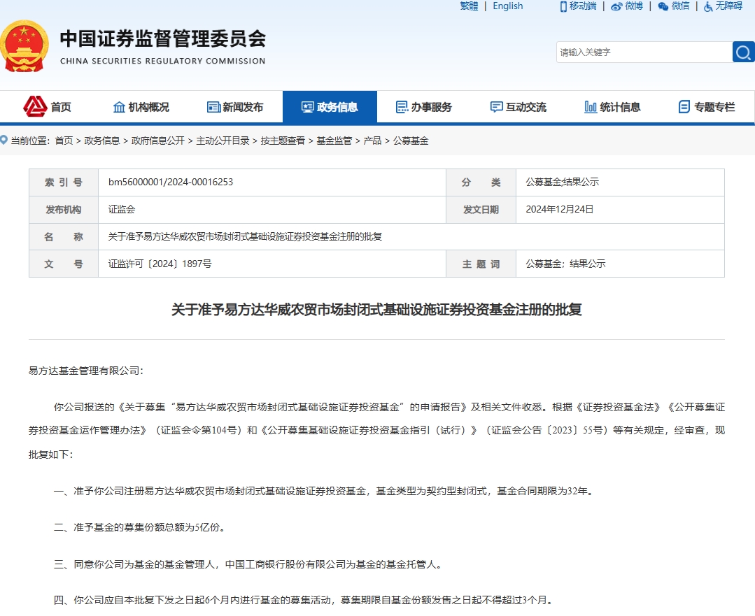 【環球網金融報道 記者 馮超男】據證監會官網消息,易方達華威農貿市場封閉式基礎設施證券投資基金(下稱“易方達華威農貿市場REIT”)於12月24日獲得准予註冊的批覆。這標誌着其有望成為我國首單專注於農貿市場的公募REITs產品。