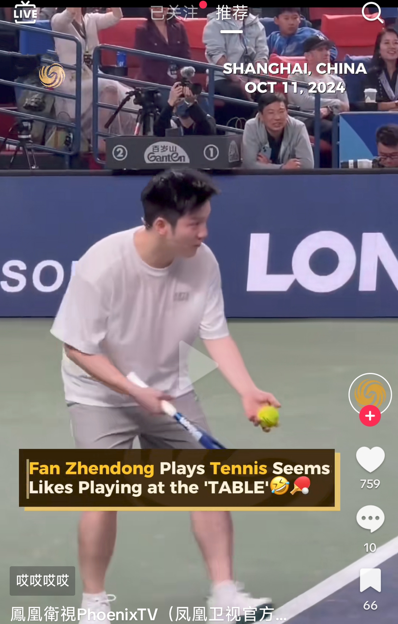在TikTok上搜索“中國網球”,甚至能看到一些其他球類運動員“跨界”。鳳凰衞視的TikTok官方賬號分享了今年10月上海網球大師賽嘉賓表演賽,乒乓球名將樊振東的網球首秀。樊振東雖然打的是網球,卻處處是乒乓球的影子,甚至還對着名將費德勒發出了一記下手ACE球。