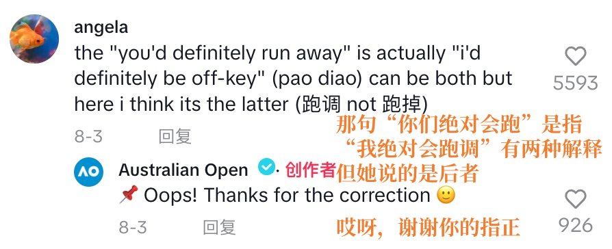 評論區裏,有網友現場教澳網學漢語:鄭欽文説的是唱歌“跑調”,而不是唱歌讓觀眾“跑掉”。澳網表示“學到了”。