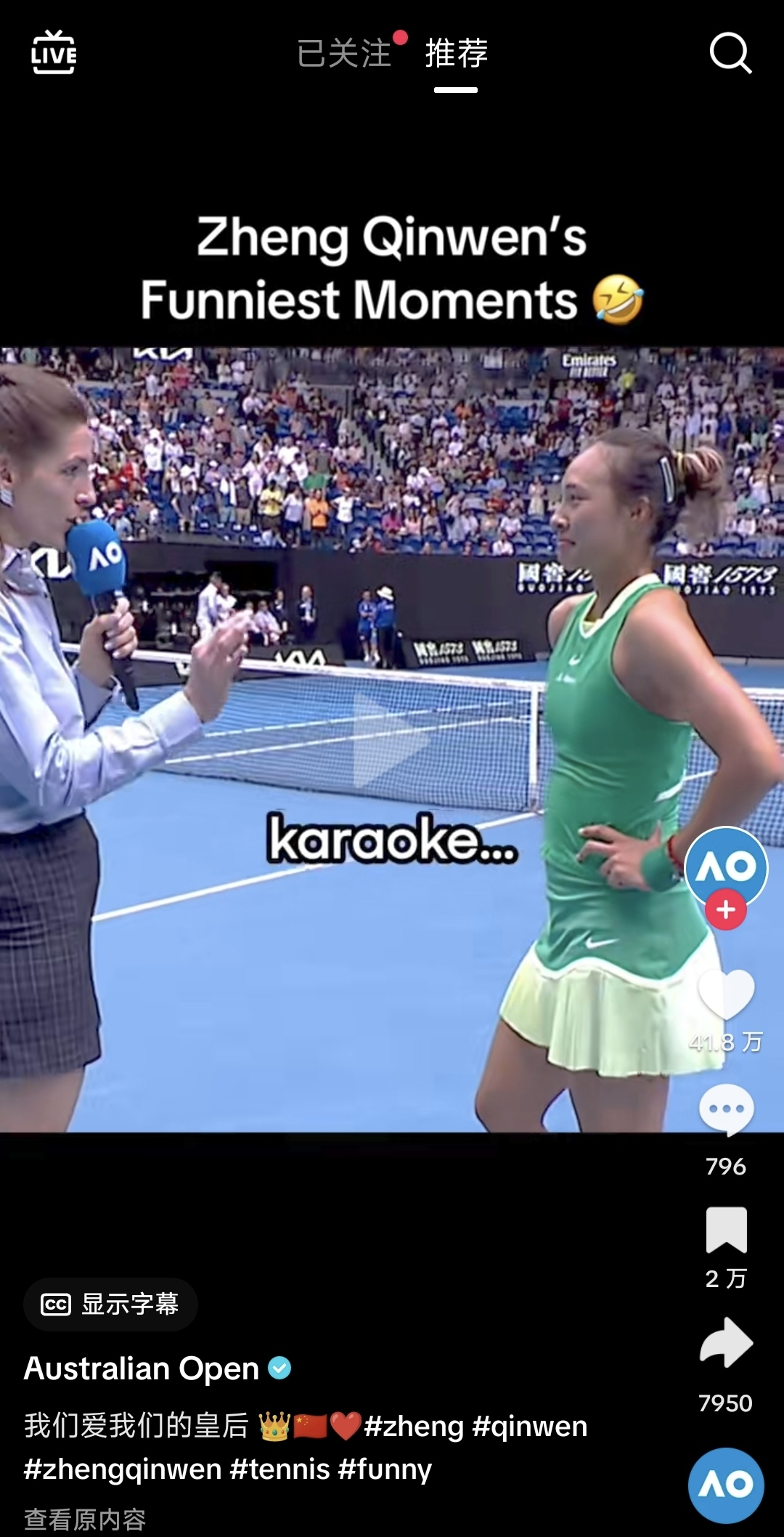 今年8月,巴黎奧運會網球女單,鄭欽文奪冠,成為中國首位奧運網球單打冠軍。四大滿貫賽事之一的澳大利亞網球公開賽,隨即在TikTok上發佈了一則題為“鄭欽文最可愛時刻”的視頻集錦。澳網親切地稱,“我們愛文女王(Queen Wen)!”該條視頻點贊量超過41萬次。