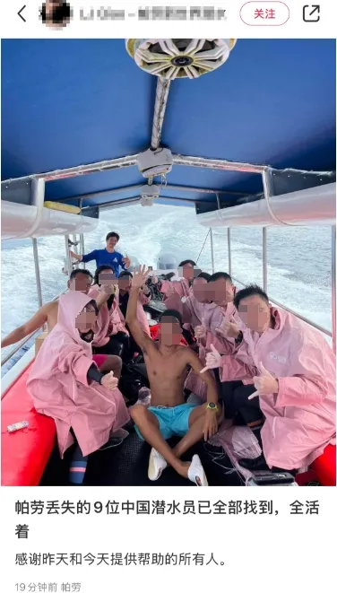 據潮新聞此前報道,剛剛“阿牛”的妻子在社交媒體表示,“在帕勞失聯的9位中國潛水員已全部找到,全活着,感謝昨天和今天提供幫助的所有人。”