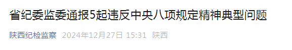 近日,陝西省紀委監委通報5起違反中央八項規定精神典型問題。以下為詳情↓↓