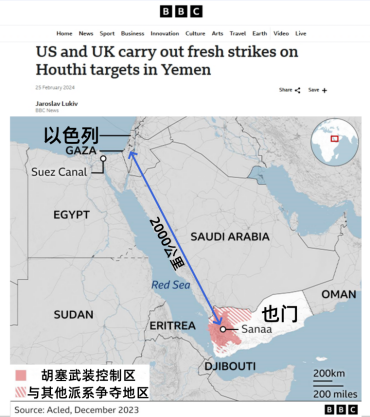 胡塞武裝控制區與以色列相距遙遠。圖/英廣播公司網站截圖