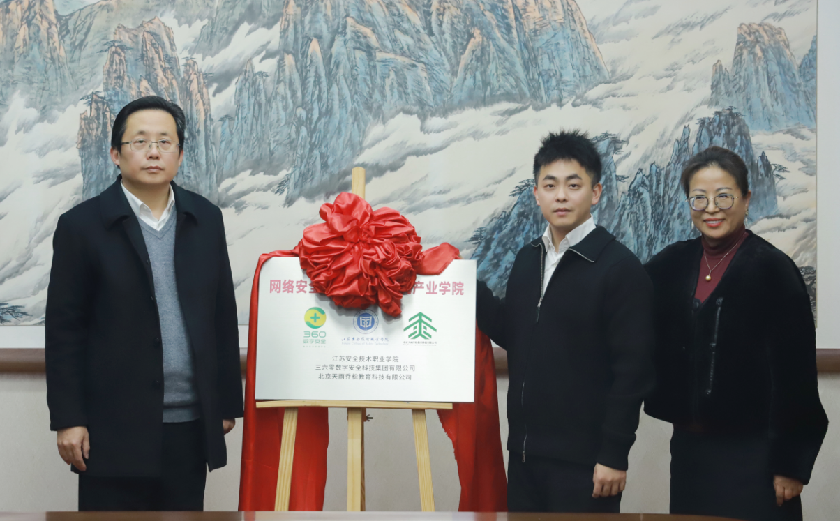 近日,360數字安全集團聯合江蘇安全技術職業學院、北京天雨喬松教育科技有限公司共同基於蘇安院-網絡安全與應急響應現代產業學院的合作共建完成戰略簽約及揭牌儀式。依託現代產業學院提供的創新平台與創新資源,校企三方將圍繞智慧校園、數字安全、人工智能、應急響應等多方面開展合作,致力於促進科教融匯、產教融合與高質量卓越人才培育,為關鍵技術攻關、新型數字城市建設、數字徐州產業升級提供充分助力。