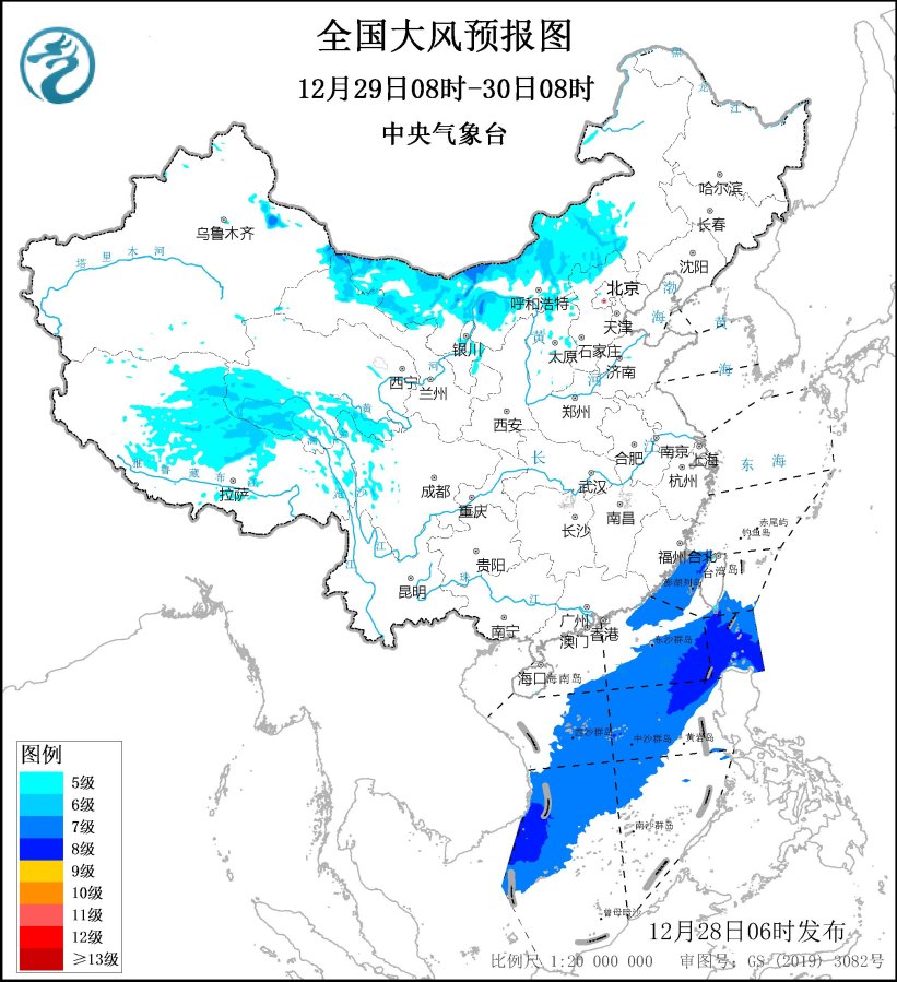 12月29日08時至30日08時,西藏中北部、青海南部、川西高原、甘肅西部、寧夏北部、內蒙古中西部、山西北部、河北北部等地部分地區有5~6級、陣風7~9級的大風;台灣海峽、台灣以東洋麪、巴士海峽、南海大部海域將有7~8級、陣風9~10級的大風。