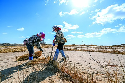 內蒙古科爾沁沙地,治沙工人在打草方格。