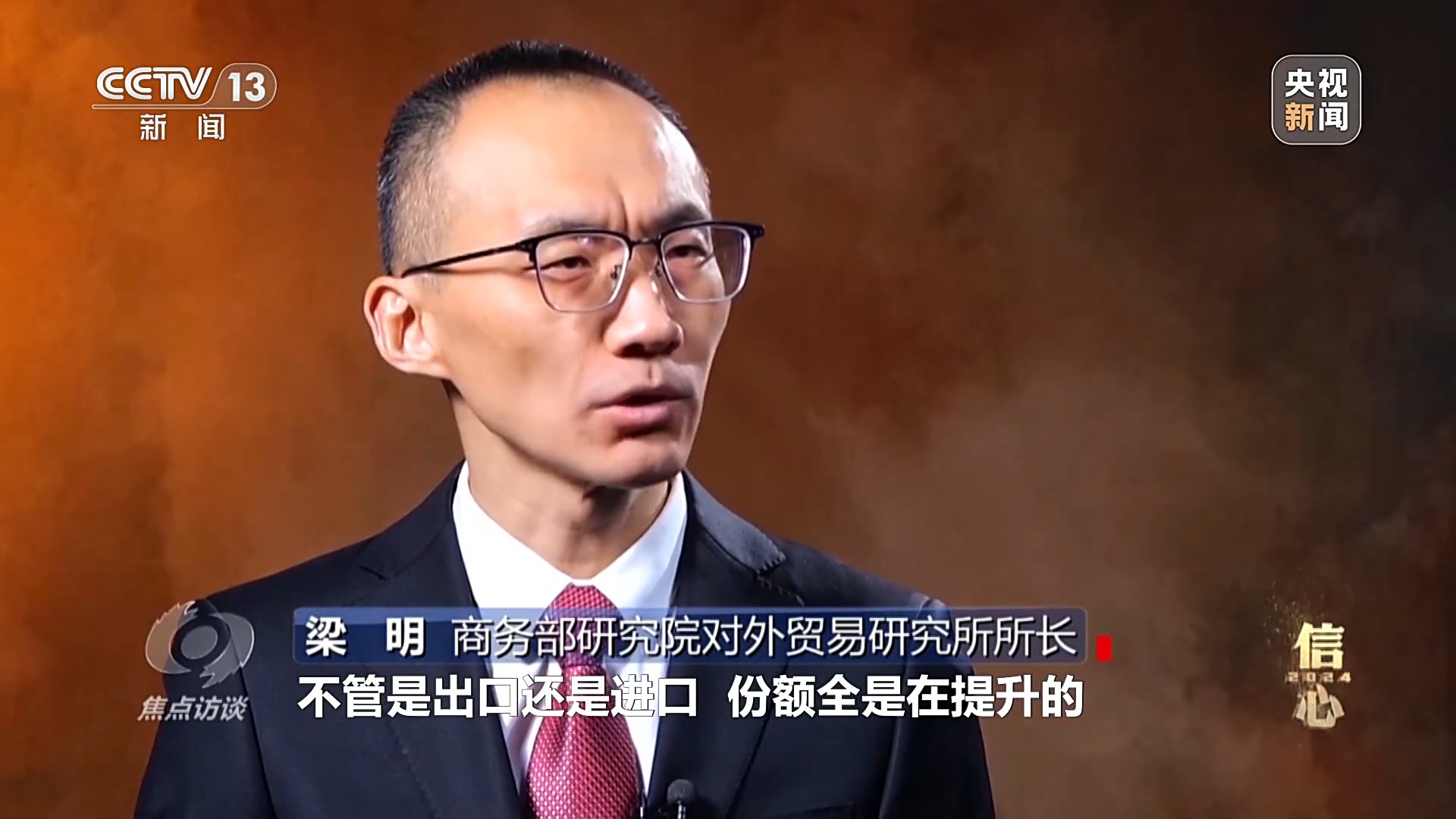 商務部研究院對外貿易研究所所長 梁明:“今年前三月,中國出口同比增速4.7%。前11月,增速達到了6.7%,在逐漸回穩向好。不管是出口還是進口,份額全是在提升的,顯示了中國貿易在全球中的地位進一步凸顯,貿易的質量,還有貿易的結構在逐步優化。”