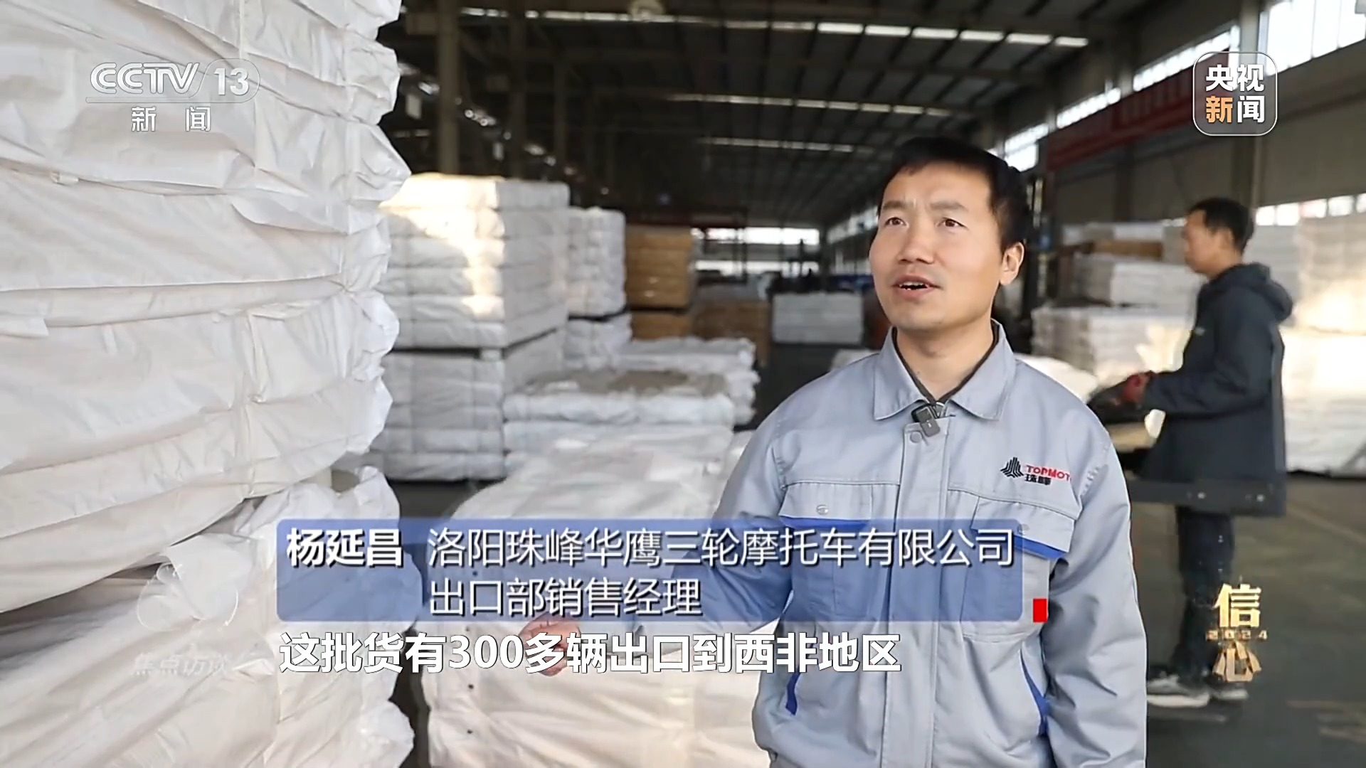 洛陽珠峯華鷹三輪摩托車有限公司出口部銷售經理 楊延昌:“這批貨有300多輛出口到西非地區,目前訂單量已經達到了3萬台,排到了25年3月份。”