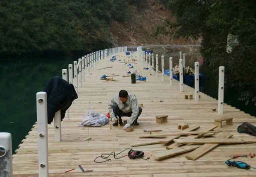 《調查報告》顯示,景區內建有兩座浮橋,分別為涉事水上浮橋和水上運動區域人行浮橋。水上浮橋全長318米,寬4.5米,淨寬3.3米。浮橋兩邊各縮進0.5米設置白色防護欄杆,欄杆立柱截面尺寸為10×10釐米,高1.1米,問距2米,為高分子聚乙烯材料,立柱之間由3檔直徑5釐米的PP-R管連接作為扶手。水上浮橋所使用的浮筒上方鋪設松木龍骨,木龍骨與浮筒銷釘上的螺絲桿相連,間距25釐米木龍骨上方鋪設木板,木板為CCA處理南方松防腐木,用木螺釘固定在木龍骨上。浮橋買用水下錨固方式國定,在堤岸與浮橋之問架設引橋,引橋一側固定在水泥基礎平合上,另一側靠落在浮筒上,引橋下裝有滾輪,在水位漲落時可前後移動,引橋面鋪設木地板,兩側配有欄杆扶手。經查,該類水上浮橋建設、運營及安全管理暫無國家標淮和規定,未列入《特種設備目錄》(2014版),《遊樂設施安全使用管理》(GB/T30220-2013)《水上游樂設施通用技術條件》(GB/T18168-2017)也未對該類浮橋進行明確。該水上浮橋應屬於新型設施設備。