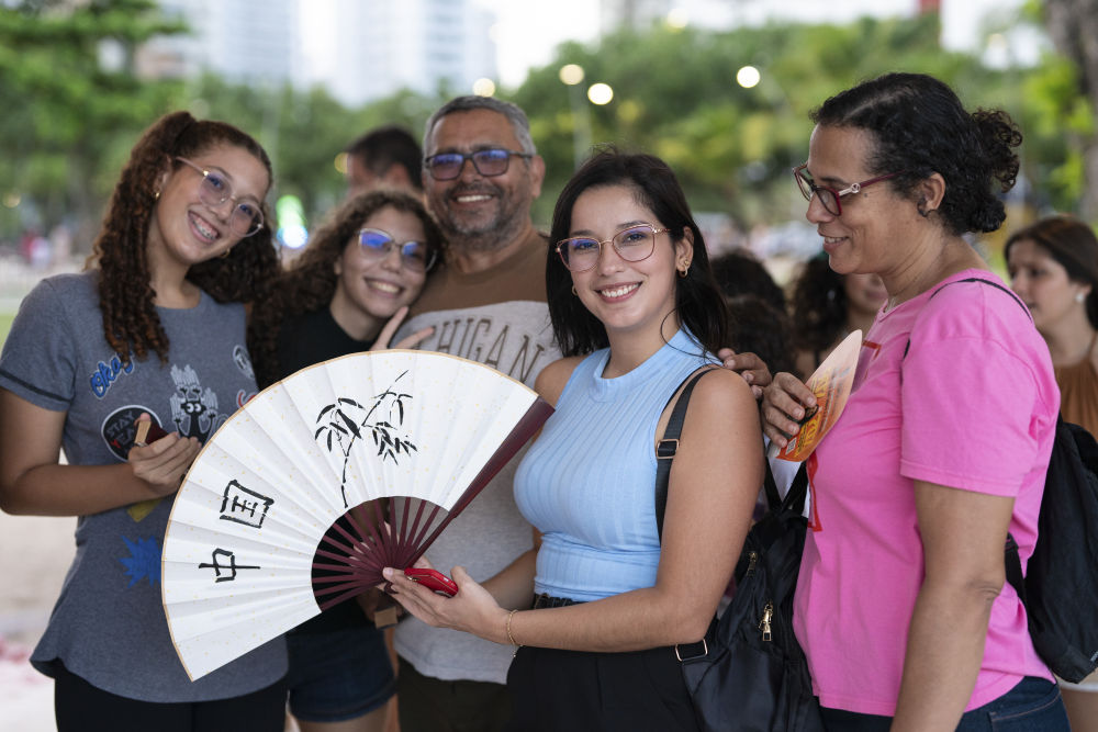 2月3日,一名女子在巴西累西腓舉行的中國春節慶祝活動上展示自己書寫的扇面。這是中國春節成為累西腓市官方節日後的第二次新春活動。
