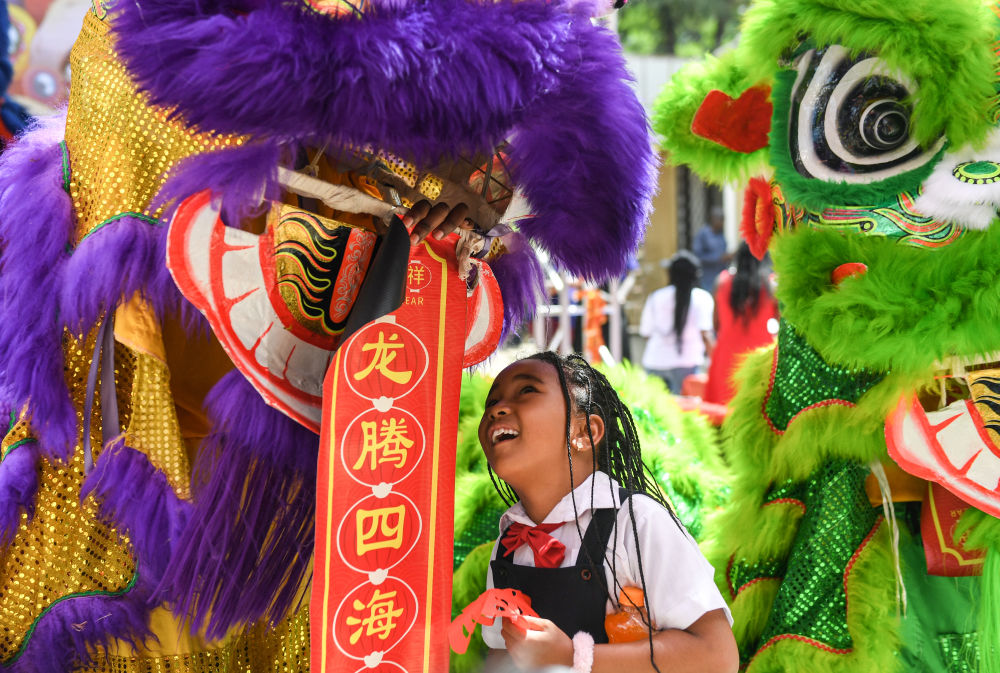 2月7日,小朋友在肯尼亞內羅畢大學孔子學院舉行的“龍騰鼓躍鬧新春”活動上與舞獅表演隊互動。