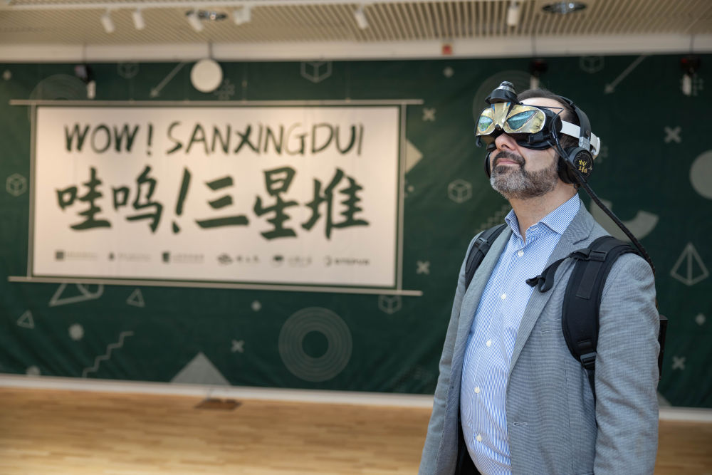 4月27日,參觀者在瑞典首都斯德哥爾摩體驗《哇嗚!三星堆》VR沉浸探索展。參觀者可以佩戴VR設備,沉浸式體驗以三星堆為代表的古蜀文化。