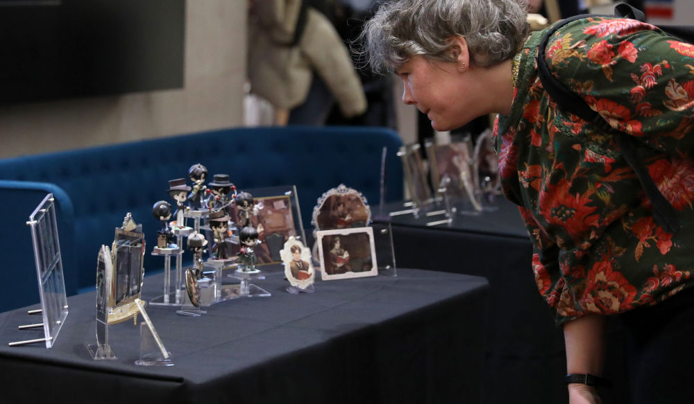11月21日,一名女子在英國倫敦大英圖書館觀看中國網絡文學作品《詭秘之主》的周邊產品。2024年,包括《慶餘年》《斗羅大陸》等在內的10部中國網絡文學作品被收錄進大英圖書館中文館藏書目。這是繼2022年16部中國網絡文學作品“入編”該圖書館以來,此類作品再次被納入其書目。