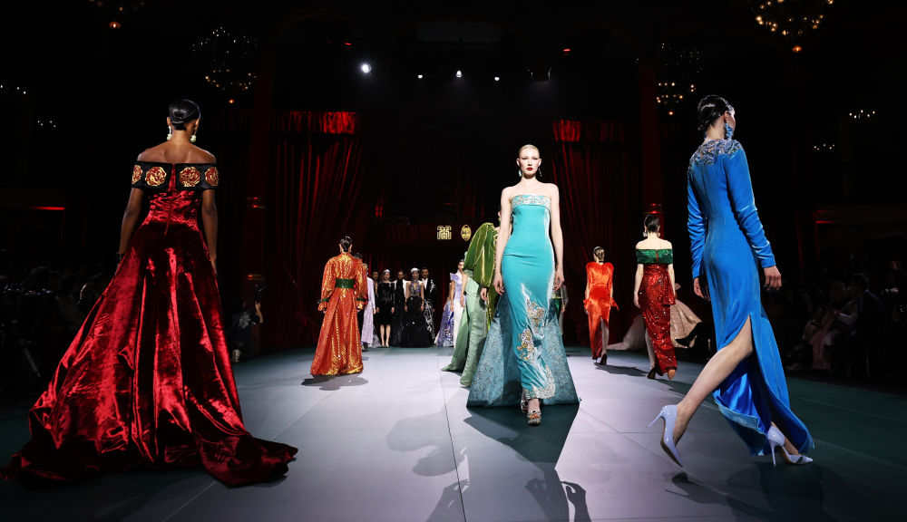 9月28日,模特在法國巴黎舉行的“恭王府服飾秀”上展示服裝。聚焦中式審美和傳統工藝的“恭王府服飾秀”共展示48套服飾,按春夏秋冬劃為4個章節輪番展示,融合苗繡、錫繡、雲錦等傳統工藝與恭王府傳統文化元素。