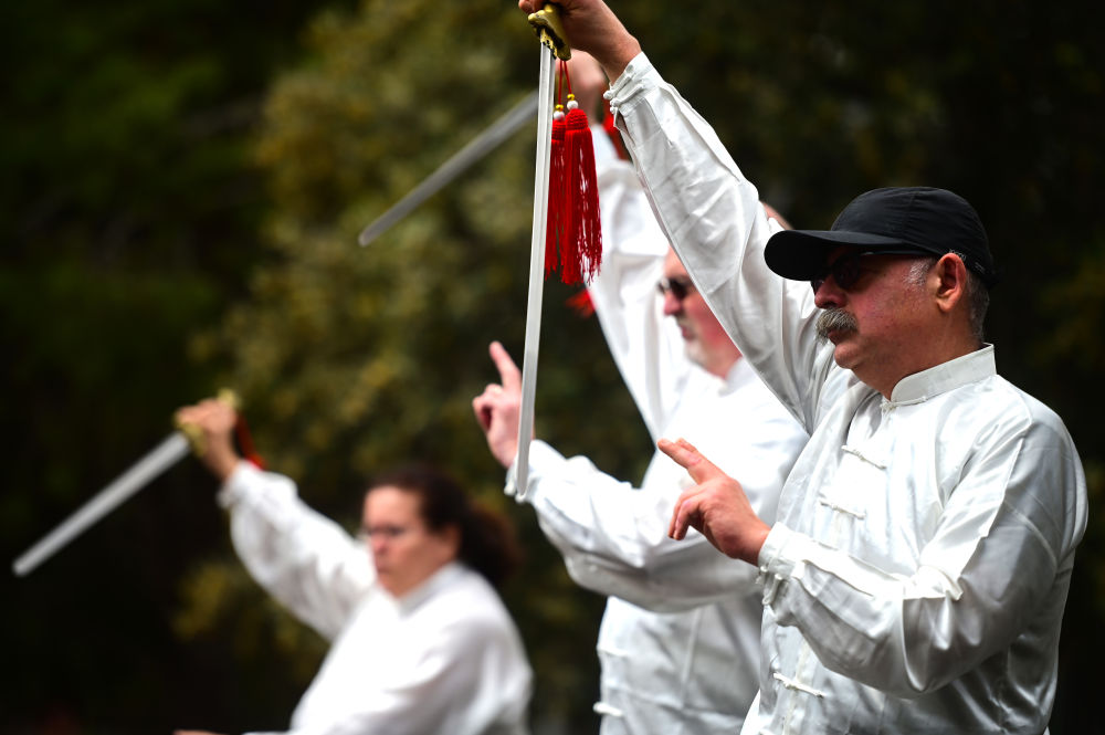 4月27日,在馬耳他桑塔露琪亞市舉辦的“世界太極日”暨“春季廟會”活動上,當地太極愛好者表演太極劍。