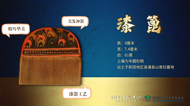 漆篦,1984年出土於和田地區洛浦縣山普拉墓地,高9釐米、寬7.4釐米,上端為半圓形柄,齒61根,排列均勻,密而不繁。