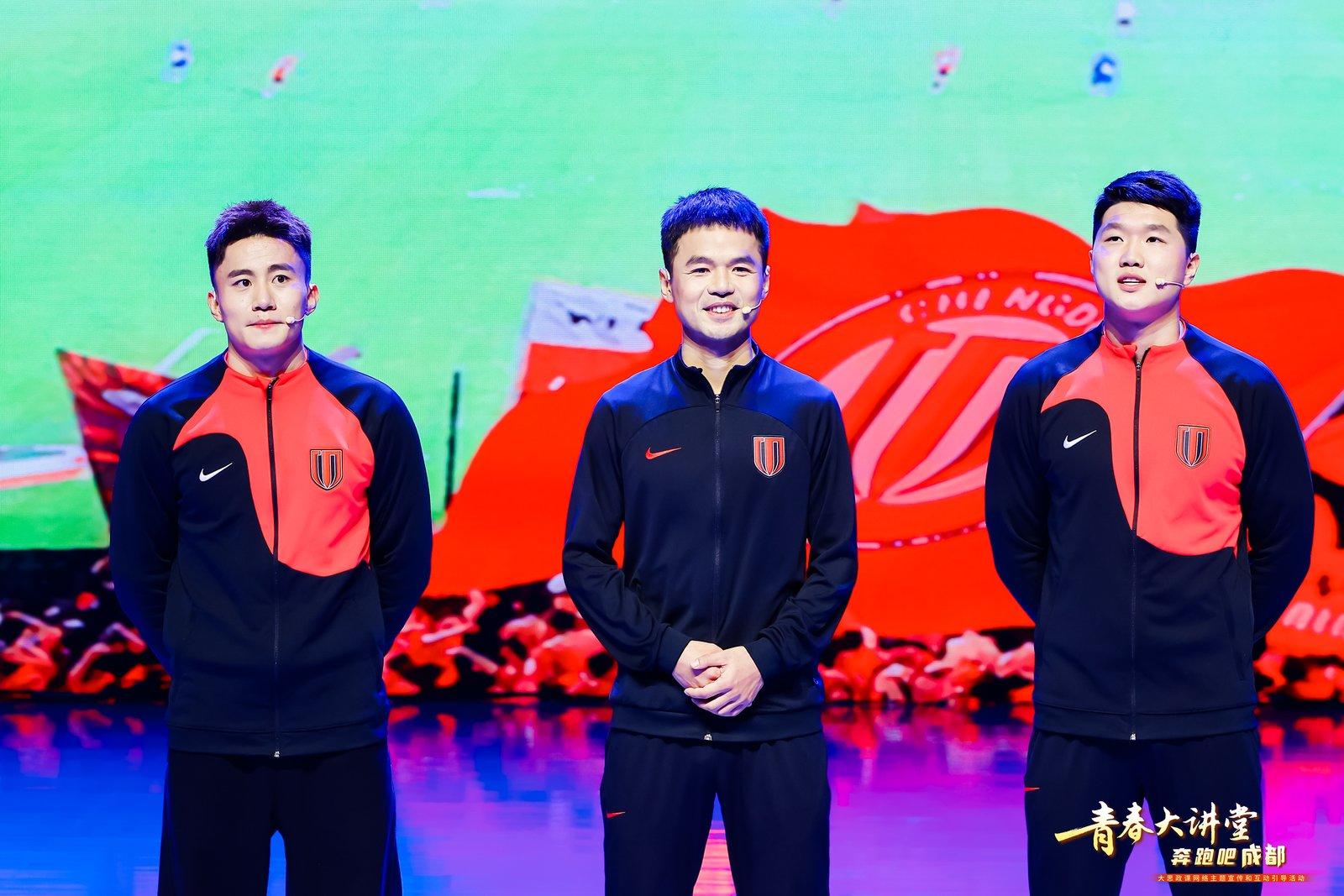 ▲成都蓉城足球俱樂部中方助理教練、前隊長甘鋭(中),成都蓉城邊衞甘超(左),成都蓉城門將蹇韜(右)共同帶來現場分享