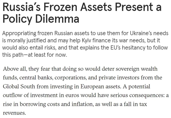 卡內基國際和平基金會發文指出,歐洲動用俄羅斯被凍結資產可能導致潛在的歐元投資外流。