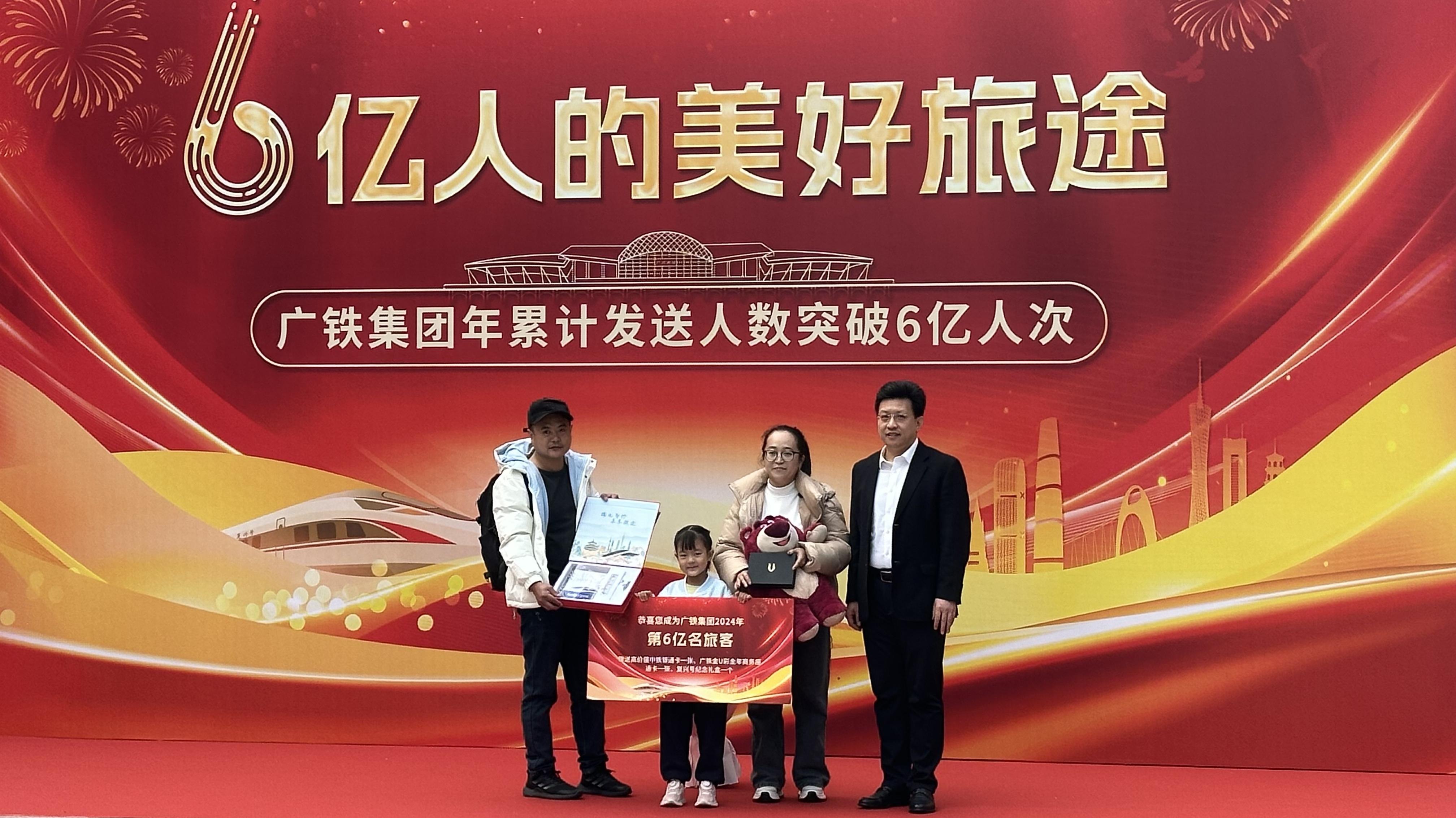 12月28日8時,楊文佳一家三口早早來到廣州南站,準備乘G566次高鐵去青島。楊文佳很幸運地成為廣鐵今年的第6億名旅客。鐵路部門為她在廣州南站候車室和所乘列車車廂舉行系列慶祝活動。