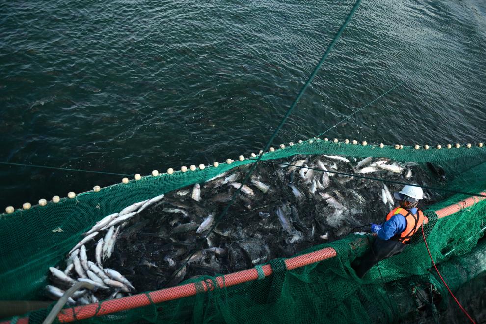 “傳統吊網捕撈會讓虹鱒魚體內因緊張產生更多肌酸。我們現在用吸魚泵連魚帶水直接送入車間,保證魚肉質鮮嫩。”他説。
