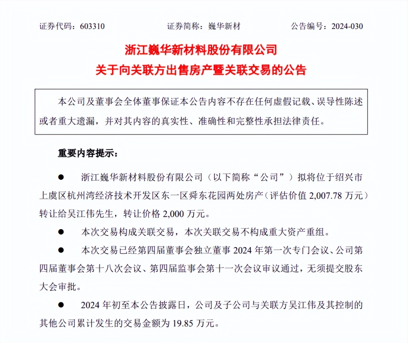 公告指出,吳江偉不僅是巍華新材的實際控制人之一,還擔任公司董事長職務,因此此次房產轉讓構成關聯交易。不過,巍華新材表示,該交易已經公司董事會審議通過,無需提交股東大會審批,同時也不構成《上市公司重大資產重組管理辦法》規定的重大資產重組。