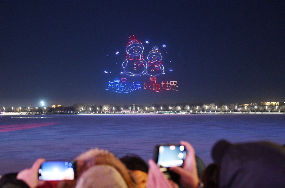 12月6日,人們在哈爾濱市人民防洪勝利紀念塔附近觀看無人機光影秀。