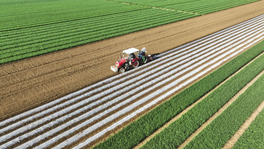 4月17日,河北省遵化市劉備寨鄉農民駕駛農機在田間播種薄膜花生(無人機照片)。