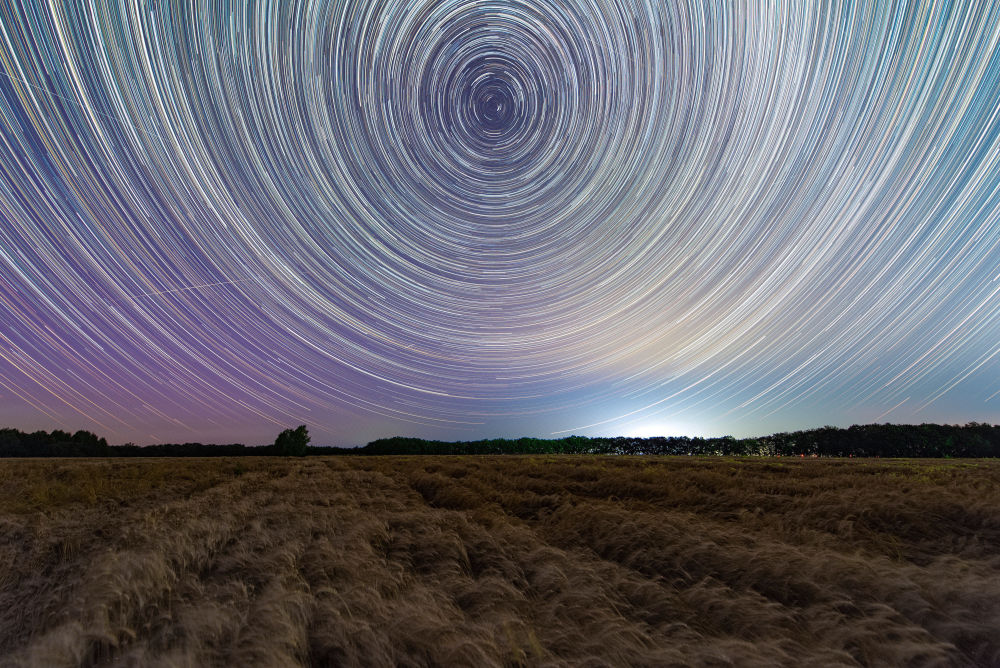 7月30日在黑龍江省富錦市上街基鎮萬有村拍攝的星空下的麥田(堆棧合成照片)。