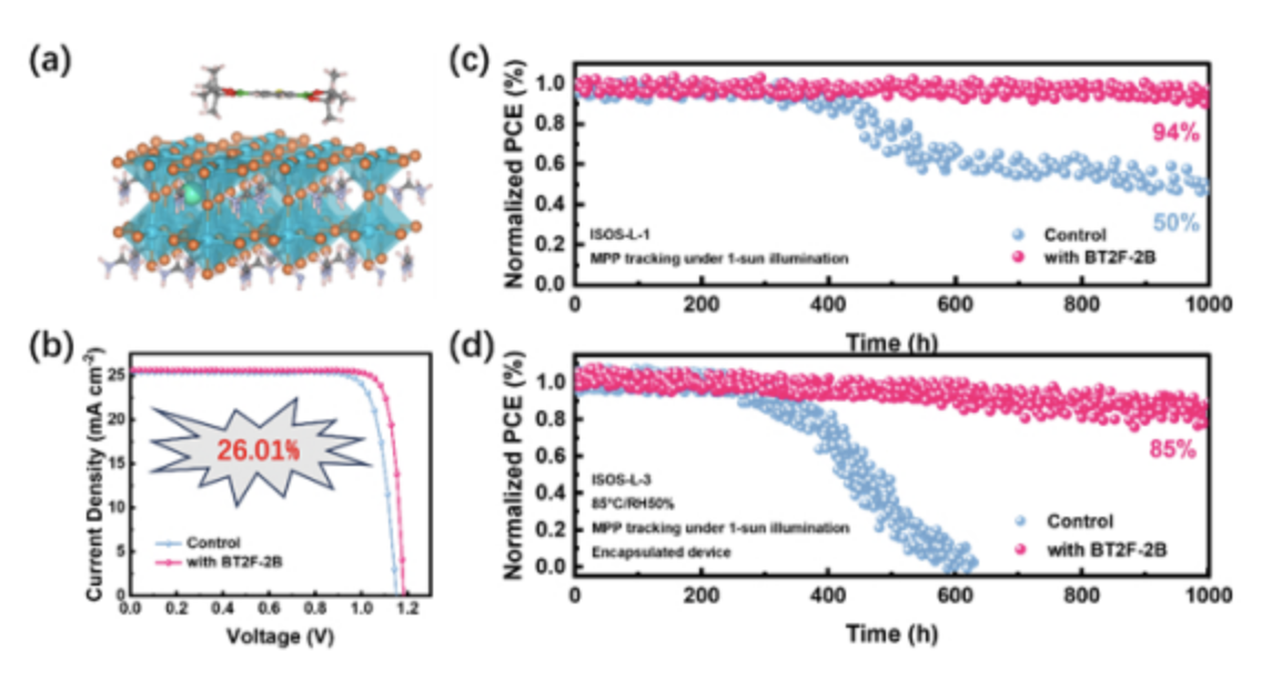 該研究將2,1,3-苯並噻二唑、5,6-二氟-4,7-雙引入到鈣鈦礦前驅體溶液。研究顯示,未雜化的p軌道與I⁻的孤對電子之間的強配位作用抑制MAI/FAI的去質子化以及隨後的I⁻向I₂的轉化,而高度電負性的氟增強了其與I⁻之間的靜電相互作用。BT2F-2B的協同作用抑制了鈣鈦礦的分解和碘空位缺陷密度。這一方法使反式單結鈣鈦礦太陽能電池的光電轉換效率(PCE)超過26%,展現出優異的運行穩定性。根據ISOS-L-3測試協議,經過處理的鈣鈦礦太陽能電池在老化1000小時後仍可保留其原始PCE的85%。當BT2F-2B應用於寬帶隙鈣鈦礦系統時,全鈣鈦礦串聯太陽能電池的PCE達27.8%,證實了這一策略的普遍性。