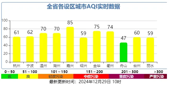 除了濕度,近期空氣質量也需要關注,會隨着一股股冷空氣的到來,起起伏伏,今日10時,全省的空氣質量總體還行,以良居多,舟山最佳,為優。